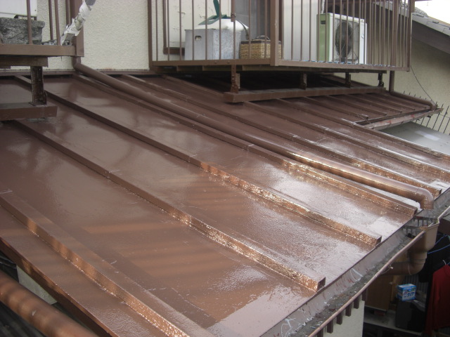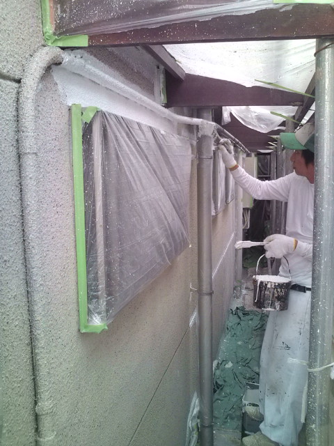 いよいよ今日から塗装作業、まずは軒裏の木が腐らないように防腐剤塗料を塗りました。