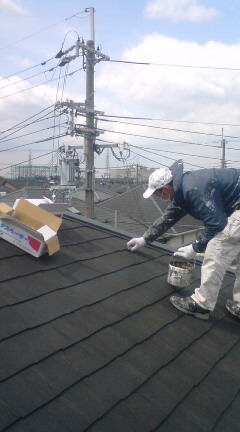 『作業内容』 ・屋根の下塗り2回目、壁の上塗り1回目