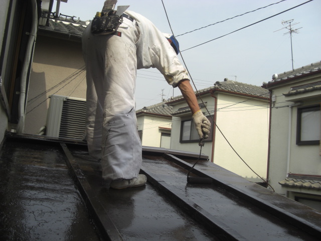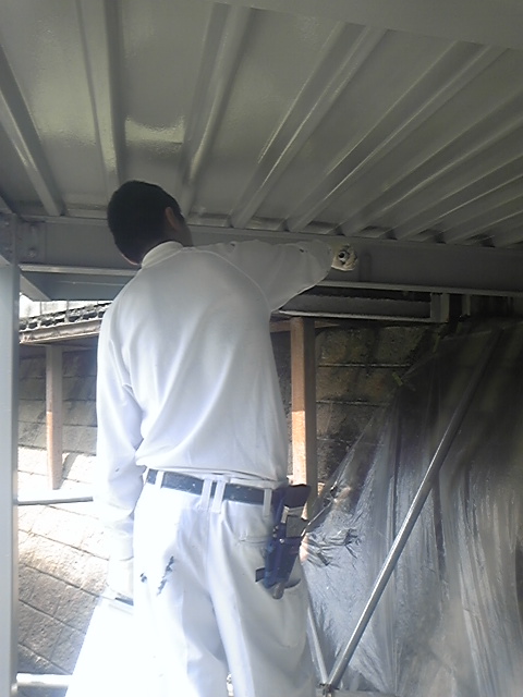 鉄部の上塗りと 仕上げ塗りを行い、土間の防水の下塗り 中塗りまで終わりました