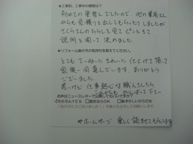 先週塗り替え完了した下村さんからアンケート手紙をいただきました!