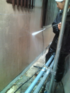 まずは高圧洗浄で汚れを洗い流して、木製外壁の下地調整をしました。