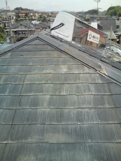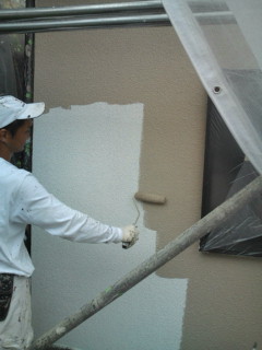Y様のお家は屋根にソーラー温水器が載っており、ソーラーの下の屋根が痛んでいたため一度機械をどかして塗装してからまたもどすという工程です。壁は上塗り一回目を塗りました。