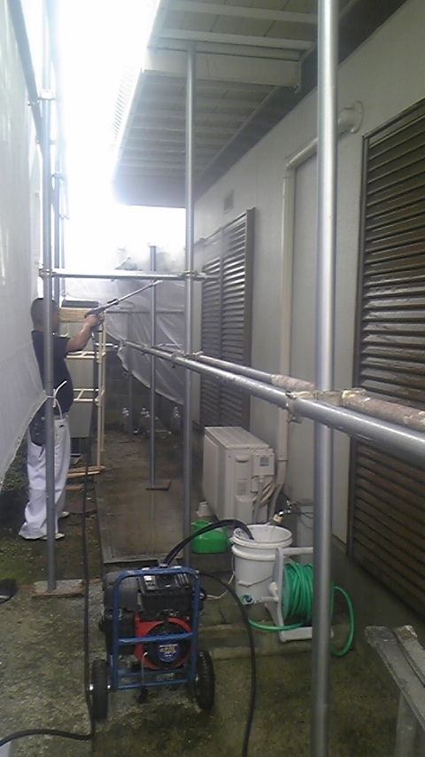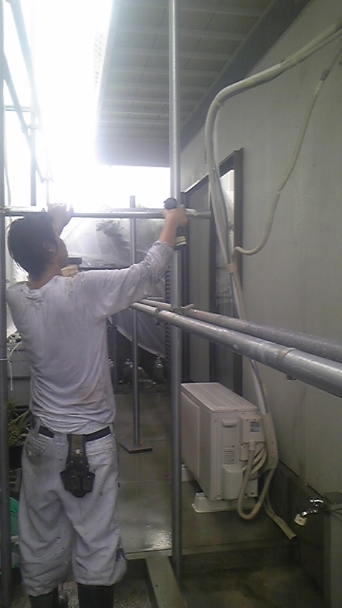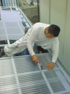 ベランダ防水の中塗りと波板の張り替えをしております!