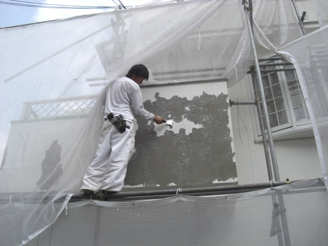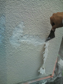 3枚目の写真は肌合わせといって、セメントで補修したところだけツルンとして目立ってしまいますので、補修した跡は周りの壁と同じように質感、柄を合わせるのです。